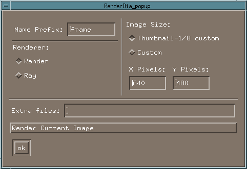 Alpha_1 User's ManualWhen rendering an animation, the method used to produced the animation has to be taken into account. Animations made with animated transformations can be rendered by all the tools in alpha_1. (See the Render/Ray User's Manual). Animations made with animated dependecy graphs can only be rendered from a special control panel in motif3d.