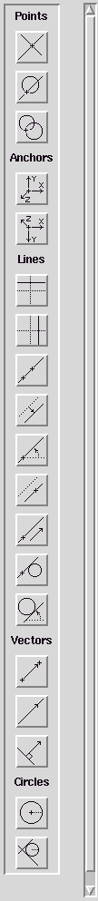 To the right of the shape3d standard viewing window is a graphical interface to Scl constructions. A picture of the graphical interface is shown to the right. There is currently only a bare minimum of constructions available graphically. Currently, points, anchors, lines, vectors and circles are supported by the graphical interface.These constructions require one or more objects to be selected as in the Construct menu. However, instead of choosing a menu item, you may simply click on the button in the graphical interface that corresponds to the desired constructor.