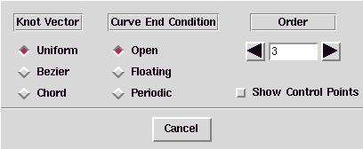 Selecting the Editing Curves ... item from the Options menu pops up a dialog box. This dialog box allows manipulation of the Knot Vector, Curve End Condition and Order of a selected curve. There is also a button to show/unshow the control points of the curve. Below is a picture of the Editing Curves ... dialog box.