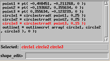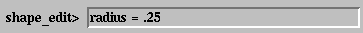 The Scl code window displays the Scl code for all the objects c_shape_edit knows about. (The built-in objects, unitcircle etc., are left out.) Shape3d assumes everything is constructed through the graphical interface (which includes the Scl text input windows). However, this is not a workable assumption at this point since the editing and I/O facilities for the text window are not sufficiently powerful to allow efficient editing.The standard terminal input via emacs can be used for input and editing until the graphical interface is developed further. When the Scl is entered via emacs, the Scl code window will not show all the Scl code unless it is forced to refresh. This can be accomplished at any time by clicking the mouse in the Scl command input window and pressing Return.