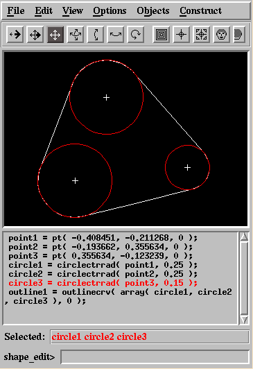 The selected objects list shows the names and order of the objects that have been selected in the graphics window. In the above image, three circles have been selected and their names appear in the selected objects list. This provides addition feedback about what you are looking at in the graphics window. The selected objects list is also important for using the graphical interface for constructions that depend on what is selected.Selecting objects in the graphics window also affects the Scl code window. The Scl code for the last selected object is highlighted in the Scl code window. The window is automatically scrolled to make the line visible. The Scl code for "circle3" (the last one selected) is highlighted in the Scl code window.