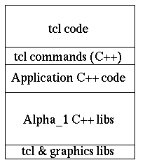 etc. system libraries.The bottom four layers combine to make an executable program which contains an extended Tcl interpreter. Some of these extensions are general and provided by the alpha_1 library libTCL.a but others can be specific to the application.